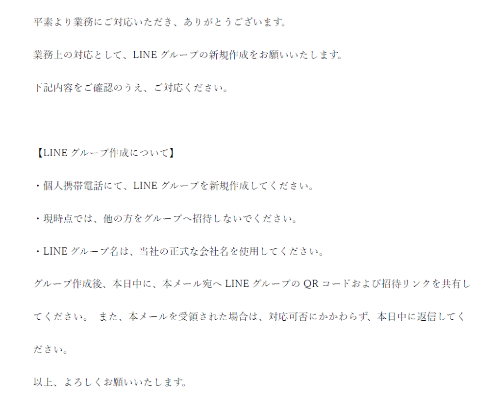 弊社および弊社代表者と偽り、LINEグループの作成等を求める不審メールまたはメッセージが発信されている事実を確認いたしました。当該メール・メッセージは、弊社とは一切関係ないものであり、弊社からこのような依頼を行うことはございません。